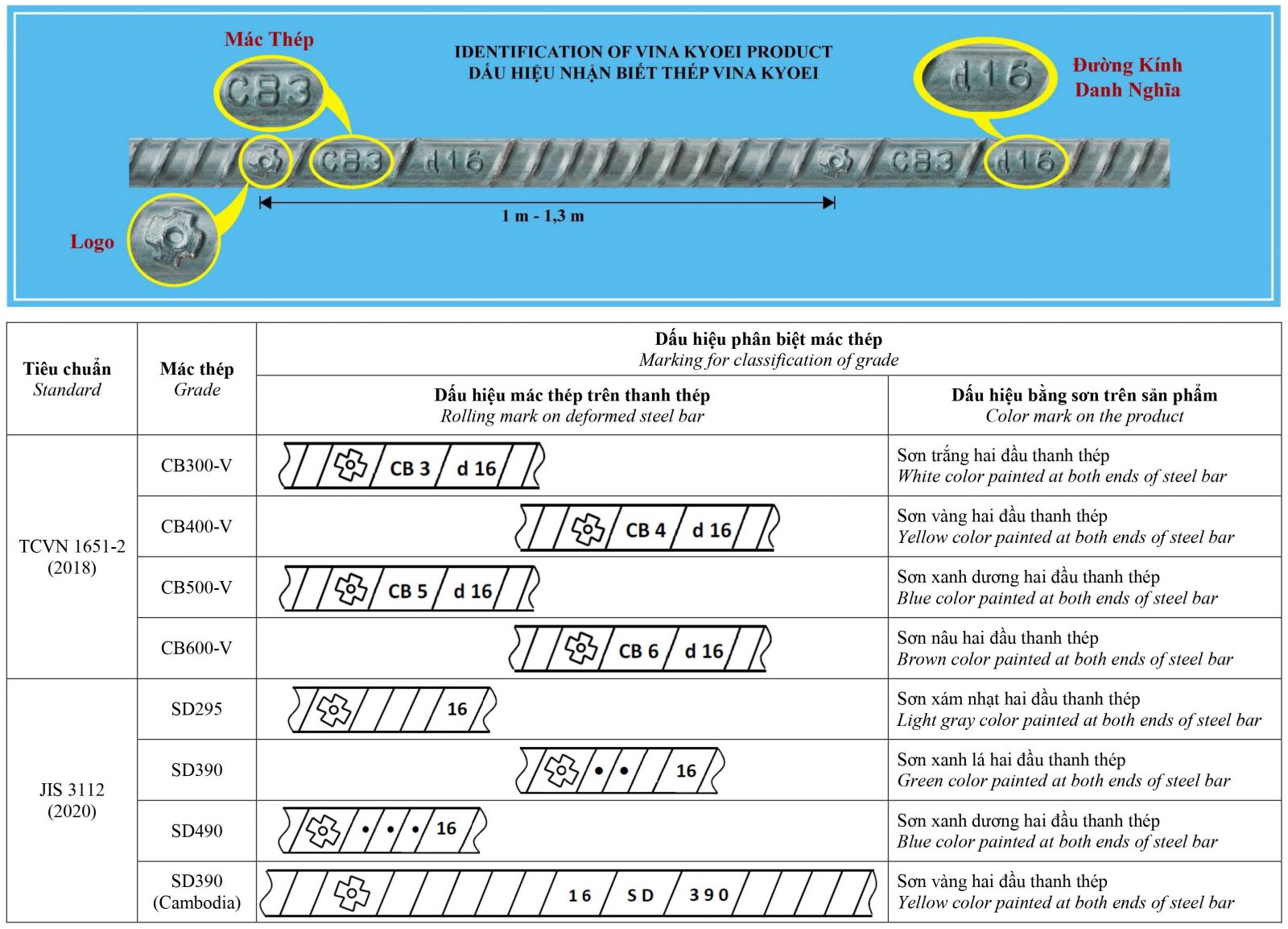 Thép cuộn dùng trong xây dựng: Từ ngày 1/2/2016, Vina Kyoei đã sản xuất thép cuộn xây dựng với dấu hiệu nhận biết mới trên bề mặt phải có chữ nổi “VINA KYOEI“, khoảng cách giữa 2 chữ nổi “VINA KYOEI” liên tiếp nhau khoảng 0,5 m.